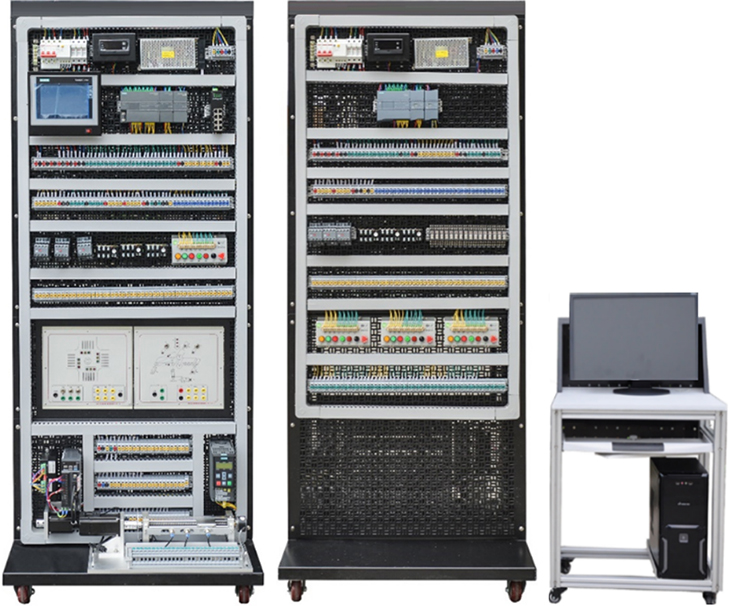 工業(yè)自動(dòng)化網(wǎng)絡(luò )控制平臺(雙面)工作臺以網(wǎng)孔架為基礎實(shí)訓單元,仿真企業(yè)真實(shí)環(huán)境,可開(kāi)展PLC系統基礎模塊連接實(shí)訓。該工作臺采用A,B雙面實(shí)訓方式,其中A工作面為西門(mén)子S7-200SMARTPLC實(shí)訓區,該實(shí)訓區由電源單元、PLC單元、PLC學(xué)習箱單元、基礎實(shí)訓單元、擴展實(shí)訓區(伺服控制小車(chē)運動(dòng)實(shí)訓單元、步進(jìn)電機單元和變頻器單元)六大部分組成。B工作面為西門(mén)子S7-1200PLC實(shí)訓區,主要分為電源單元、PLC單元、基礎實(shí)訓單元三部分組成。