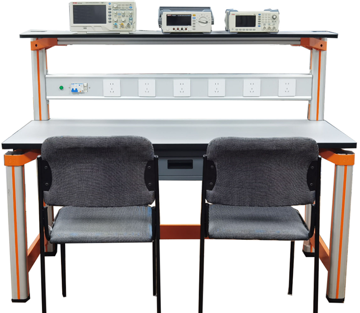 實(shí)驗桌后面二支截面尺寸70mm×70mm桌腳向上延伸,與一次成型鋁壓鑄框架連接構件構成(非焊接工藝)牢固的支架,與儀器架、電源控制箱組成一個(gè)完整的實(shí)訓屏。