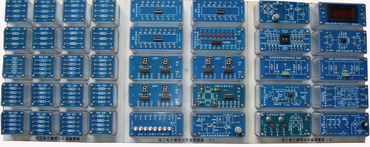 提供電工電子透明實(shí)訓模塊,可以完成直流電路、模擬電子技術(shù)、數字電子技術(shù)和電子綜合應用實(shí)訓項目。實(shí)訓模塊面板采用PCB板制作而成,器件和信號接口均已引至板上的專(zhuān)用插座,實(shí)訓模塊有四個(gè)彈性插腳,與專(zhuān)用實(shí)訓孔板配套使用。
