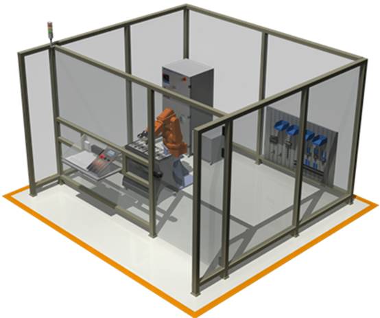 安全護欄:隔離護欄,高1000mm,框架采用2mm厚灰色棟梁鋁合金型材,鋼化玻璃10mm厚;工作站全部通透利于觀(guān)察,玻璃中間沒(méi)有隔斷;并安裝一個(gè)側開(kāi)門(mén);門(mén)上安裝安全檢測元件,機器人自動(dòng)運行必須在門(mén)關(guān)閉狀態(tài)下進(jìn)行;系統工作站安裝有3個(gè)急停按鈕,分別位于操作控制臺、模型安裝臺、隔離護欄上,以備緊急情況使用。