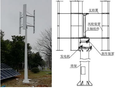 風(fēng)力發(fā)電系統由一臺2KW垂直軸風(fēng)力發(fā)電機組、葉片、風(fēng)機控制器塔架等組成。