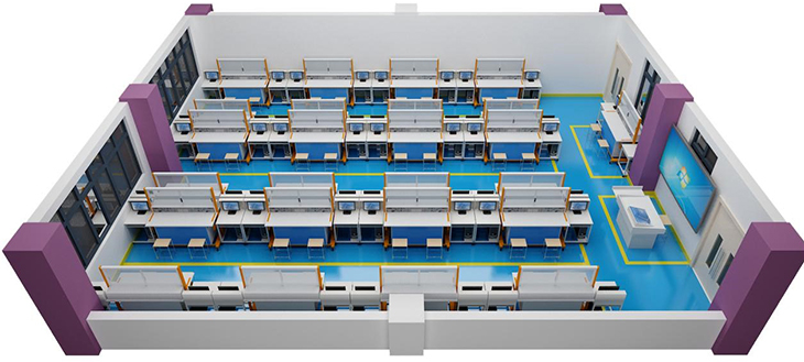 2、實(shí)訓桌桌面采用25mm麻灰色高密度層壓板封邊特制,有效提高絕緣等級;實(shí)驗桌底部裝有至少4個(gè)導向輪,方便實(shí)訓臺架移動(dòng);