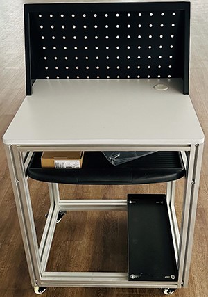 配置: 22、功能:工業(yè)鋁型材框架結構,單工位,設有電腦主機位及鍵盤(pán)支架,用于放置編程電腦。