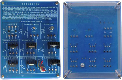 底盒使用190mm×145mm的開(kāi)模有機透明塑料底盒,模塊面板采用印制電路板PCB工藝,可以直觀(guān)看到器件的實(shí)物及相關(guān)的原理介紹。對于典型應用及易損器件安裝在面板背面,透過(guò)透明底盒能夠看到器件實(shí)物,方便感性認識、檢測測試,同時(shí)也能防止器件的損傷。