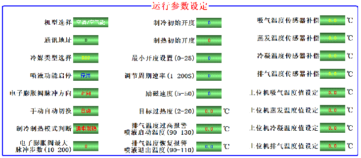 11)、顯示界面上29 路參數控制參數設置/查詢(xún):控制器內所有與控制相關(guān)的溫度參數、時(shí)間參數、控制參數、等29個(gè)參數都可以調整,以適應制冷/熱泵/冷庫/水機等設備。