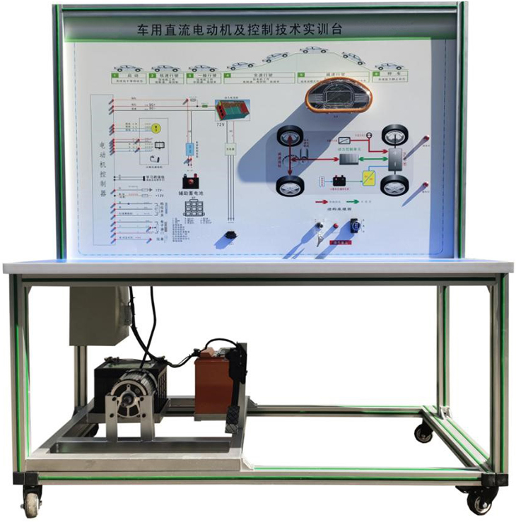 檢測控制面板(裝有各種檢測端子,1448×940mm彩色電路圖和工作原理示意圖)、組合儀表、點(diǎn)火開(kāi)關(guān)、電機控制器、車(chē)載充電器與充電接口、DC-DC轉換器、鋰動(dòng)力電池組、電動(dòng)車(chē)電機(直流無(wú)刷電機)、剎車(chē)開(kāi)關(guān)、檔位開(kāi)關(guān)、油門(mén)控制裝置、大電流繼電器、電源總開(kāi)關(guān)、急停開(kāi)關(guān)、輔助蓄電池(12V45AH)、一體化全鋁合金型材搭建的移動(dòng)臺架(1500×700×1700mm (帶自鎖腳輪裝置,帶安裝檢測端子的原理面板,面板1448×940mm)、設備操作說(shuō)明書(shū)。
