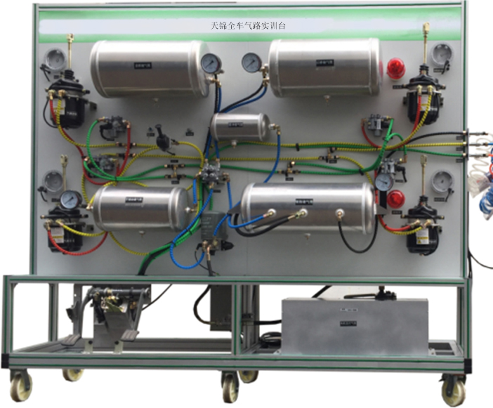 1.臺架上具有的全新東風(fēng)天錦EQ1120GA2原車(chē)零部件有空氣壓縮機總成、空氣干燥劑、前橋儲氣筒、后橋儲氣筒、手制動(dòng)儲氣筒、再生儲氣筒、輔助儲氣筒、四回路保護閥、制動(dòng)腳閥、駐車(chē)閥、繼動(dòng)閥、制動(dòng)管路、氣壓表若干個(gè)。