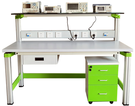 實(shí)訓桌規格為1600(長(cháng))*700(寬)*1350(高),設有二個(gè)抽屜;實(shí)驗桌主體結構全部采用高性能表面氧化的鋁型材及一次成型鋁壓鑄框架連接構件,連接構件采用壓鑄成型工藝(非焊接工藝),經(jīng)機加工、拋丸、噴砂,表面靜電噴涂工藝,安裝方便、快捷,用戶(hù)可自行DIY組裝。桌體立柱采用工業(yè)鋁型材成型工藝,表面氧化處理,截面尺寸:70mm×70mm,四面帶槽,槽寬約8mm,端部裝有注塑成型配套塑料堵頭。桌面采用25mm三聚氰胺飾面板,配有一塊防靜電絕緣皮。貼桌面板下設支撐框架,承受力不少于200kg。配備儲存柜,存放元件及工具,儲存柜底部4只高強度萬(wàn)向可制動(dòng)PU腳輪,方便移動(dòng)。實(shí)訓裝置整體簡(jiǎn)約不簡(jiǎn)單,高端大氣,符合現代化產(chǎn)品審美和發(fā)展趨勢。