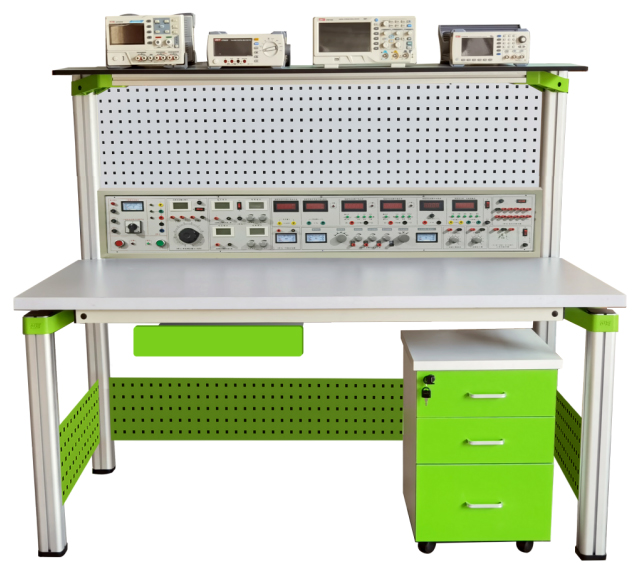 本實(shí)訓臺主要由實(shí)訓機頭、儀器架、電源控制箱、獨立實(shí)訓電路模塊、實(shí)訓桌(含磁吸式實(shí)訓基座)、儲存柜、學(xué)生凳等組成。