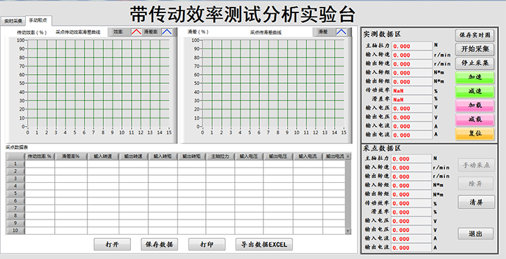 2、通過(guò)觸摸屏顯示面板顯示面板讀數進(jìn)行平皮帶傳動(dòng)效率的測定,人工繪制滑差曲線(xiàn)和效率曲線(xiàn)。