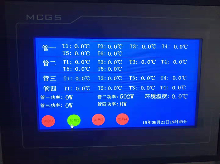 配有四根不同長(cháng)度和直徑的電鍍紫銅管,管內設置電加熱器;每根管子的表面裝4~6支測溫傳感器,以測定其表面平均溫度,測溫傳感器采用進(jìn)口DS18B20;每根橫管電加熱器配備電子集成固體調壓模塊無(wú)機調節。測試儀表箱設有(每根橫管電加熱器)數顯功率表;所有測試數據由7寸觸摸屏同屏顯示,不銹鋼實(shí)驗支架。