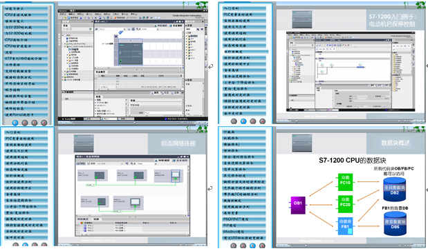 配有S7-1200 PLC學(xué)習軟件,方便老師教學(xué),提供有功能與特點(diǎn)、模塊安裝、選型、工作原理、支持的數據類(lèi)型、數據的存取方式、程序結構、編程軟件的安裝、編程軟件界面介紹、硬件的組態(tài)、入門(mén)實(shí)例、PLC變量表的使用、使用交叉引用、組織塊使用示例、基本位邏輯指令、上升沿-下降沿指令、置位-復位指令、接通延時(shí)定時(shí)器、比較指令、移位-循環(huán)移位指令、基本邏輯運算指令、數據塊概述等50多個(gè)學(xué)習項目。PLC學(xué)習軟件參考界面如下: